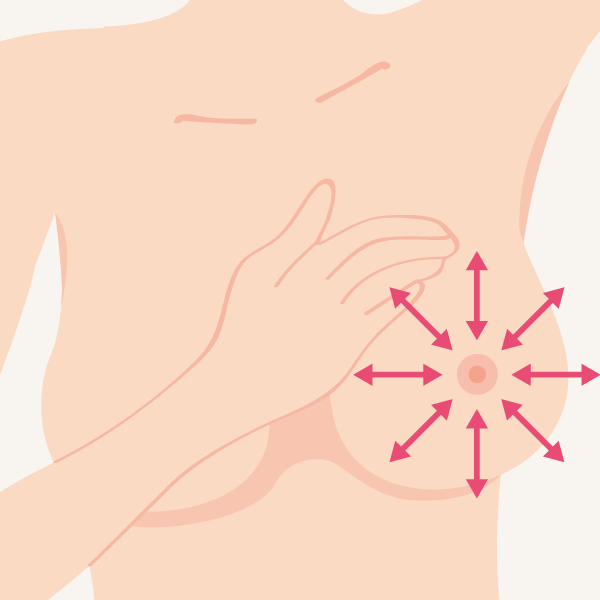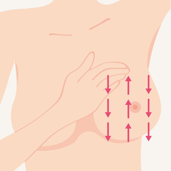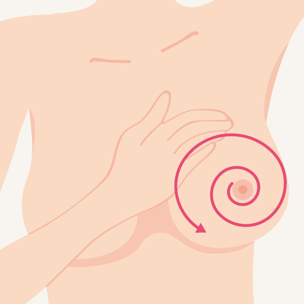 Jednu ruku si založte za hlavu a troma prstami druhej ruky si skontrolujte celý prsník krúživými pohybmi od podpazušia až po bradavku tak, aby ste skontrolovali celú plochu. Pri prvom vyšetrení netlačte na prsník, skontrolujete tak podkožie. Pri druhom vyšetrení mierne zatlačte, aby ste preskúmali hlbšie tkanivá.